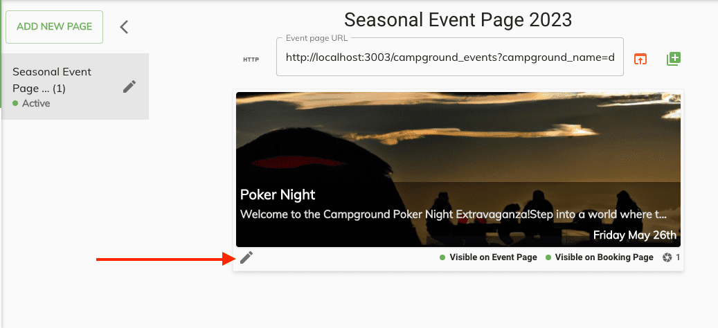 The campground event admin page allows you to control which events are displayed on your website and create new event pages which can be linked directly from your website.