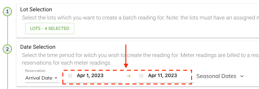 Step 2 select the reservation time range. Meter readings are billed to a reservation therefore, this will limit the meter readings entries based on the lot selection and the reservations associated to them for the selected time range.