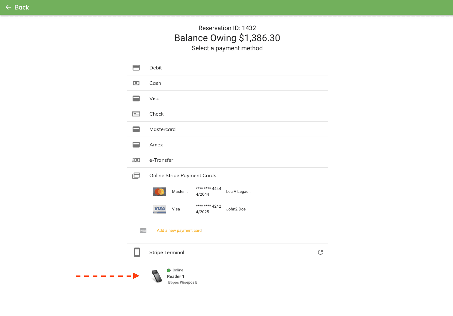 At the payment screen, select the Stripe Terminal payment method. If you have more than one terminal reader, select the terminal reader you want to use for the payment.