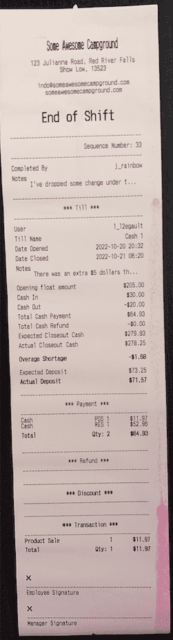 The end of shift receipt has an area at the bottom that can be used to assign accountability by having the employee and the manager sign the receipt.