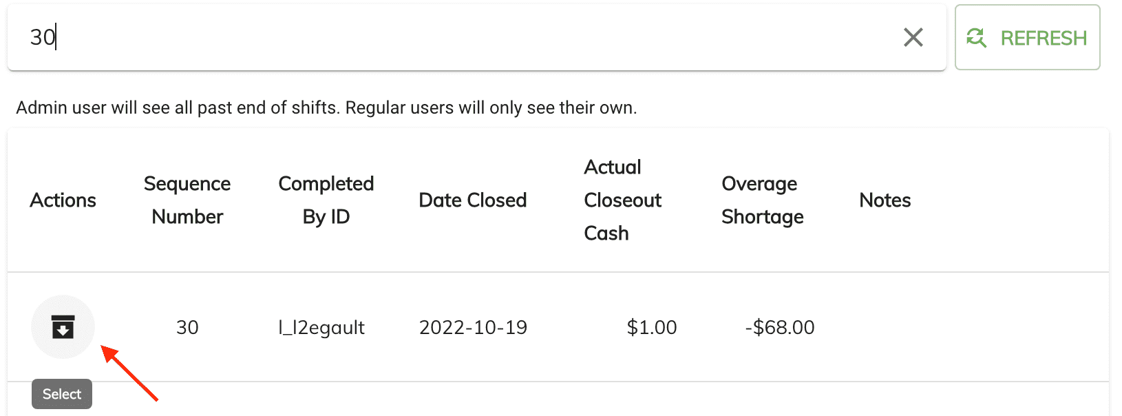 To open up a past end of shift simply click on the Select Icon action button of the item you would like to open.